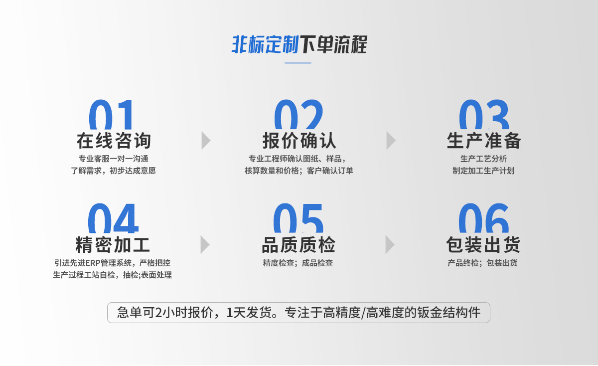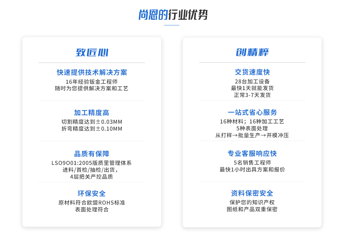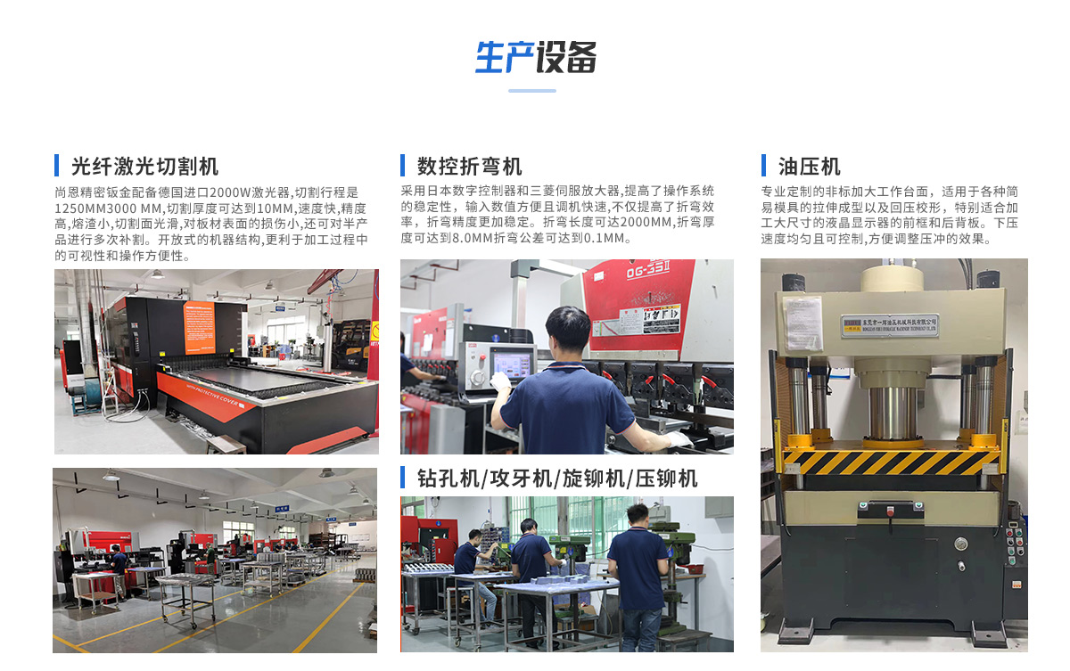 尚恩精密鈑金引進型的光纖激光切割機,數(shù)控折彎機,壓鉚機,旋鉚機,焊接機,定制超大工作臺面的油壓機等生產(chǎn)設備,切割精度可達±0.03mm,折彎精度可達±0.10mm,快可以1天交貨,正常發(fā)貨3-7天。